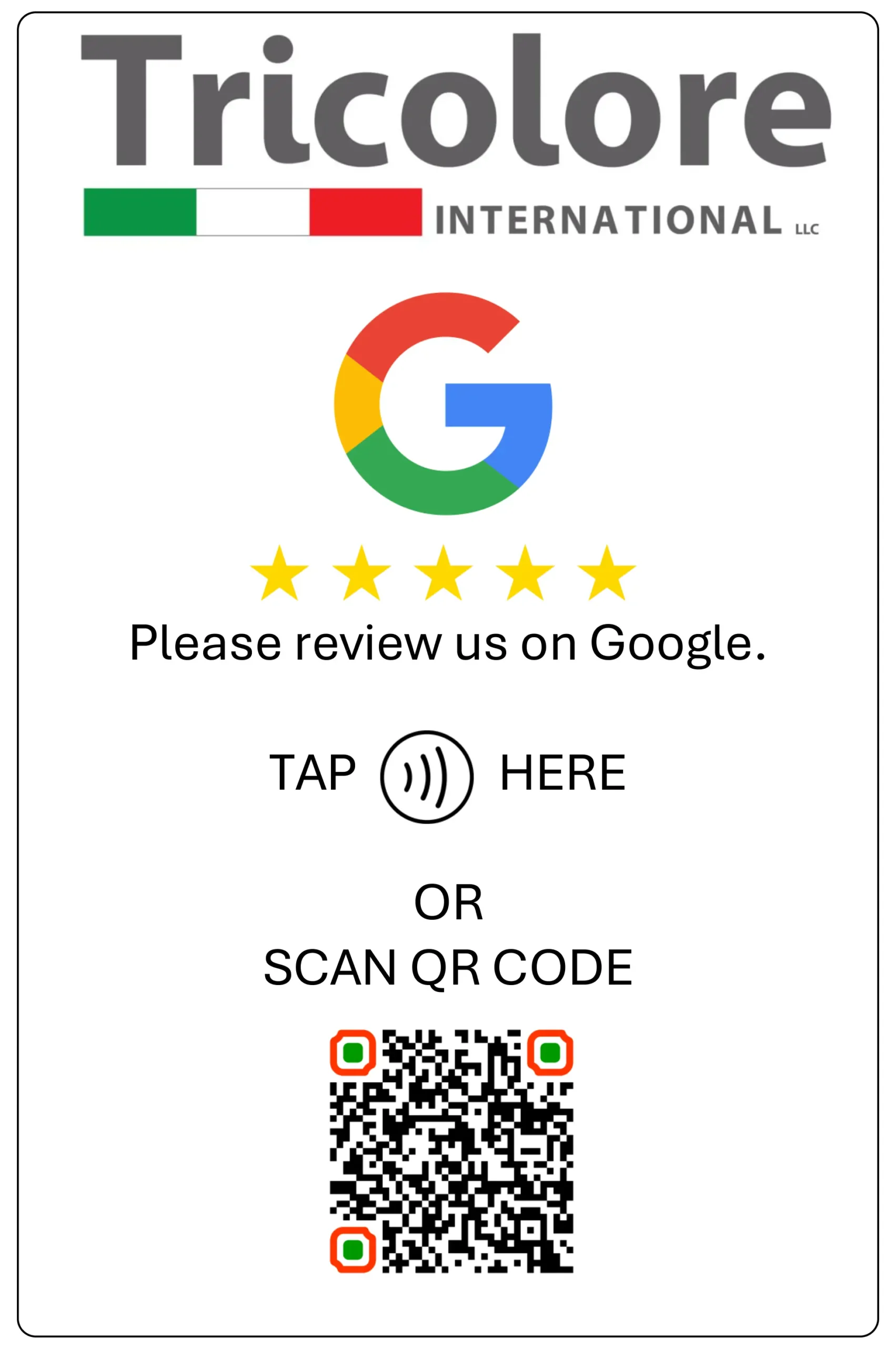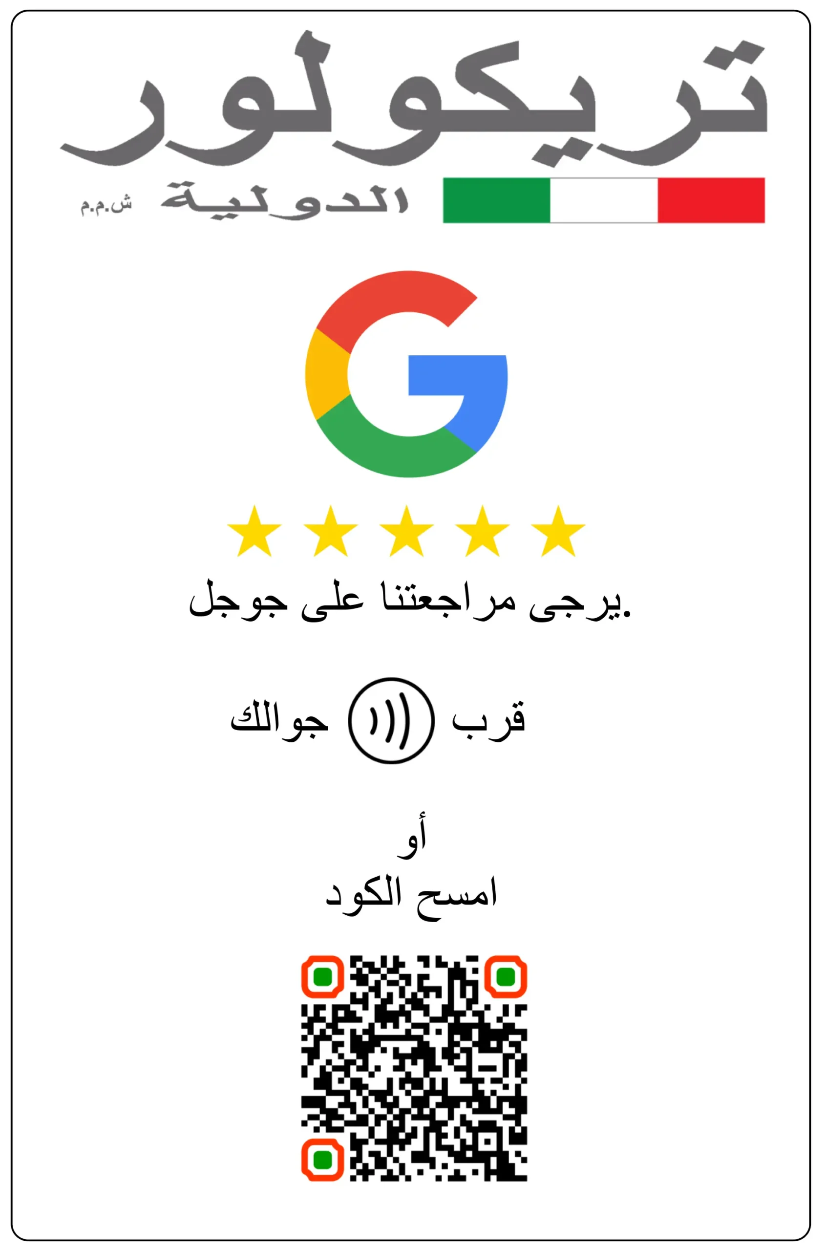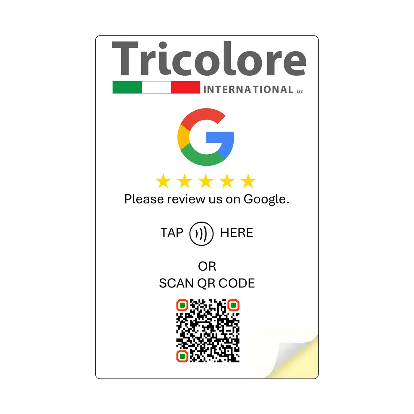 With this option, you can display a sticker on any door, window or counter window in A4 or A6, completely customized with your logo and linked to any social media platform. Most of our business/customers use it for Google Reviews.
